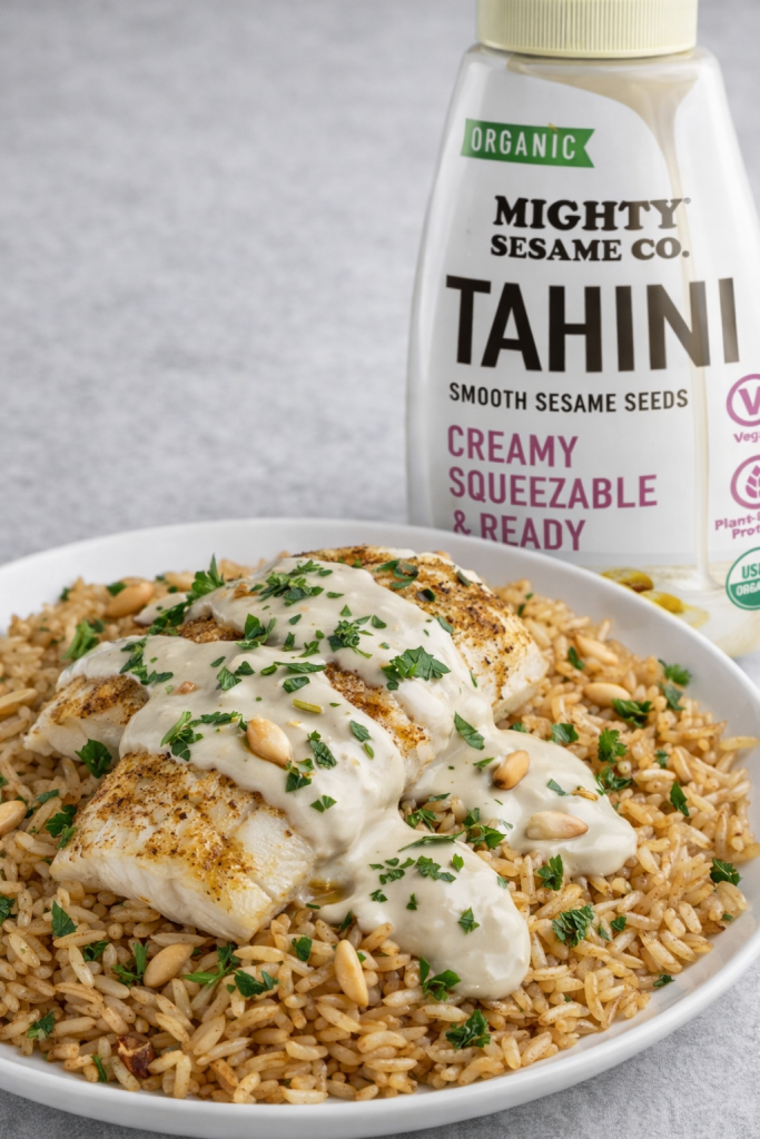For those seeking convenience, Mighty Sesame Co.’s modern tahini format allows you to skip lengthy stirring or thinning processes, so you can focus on perfecting the rice and fish.