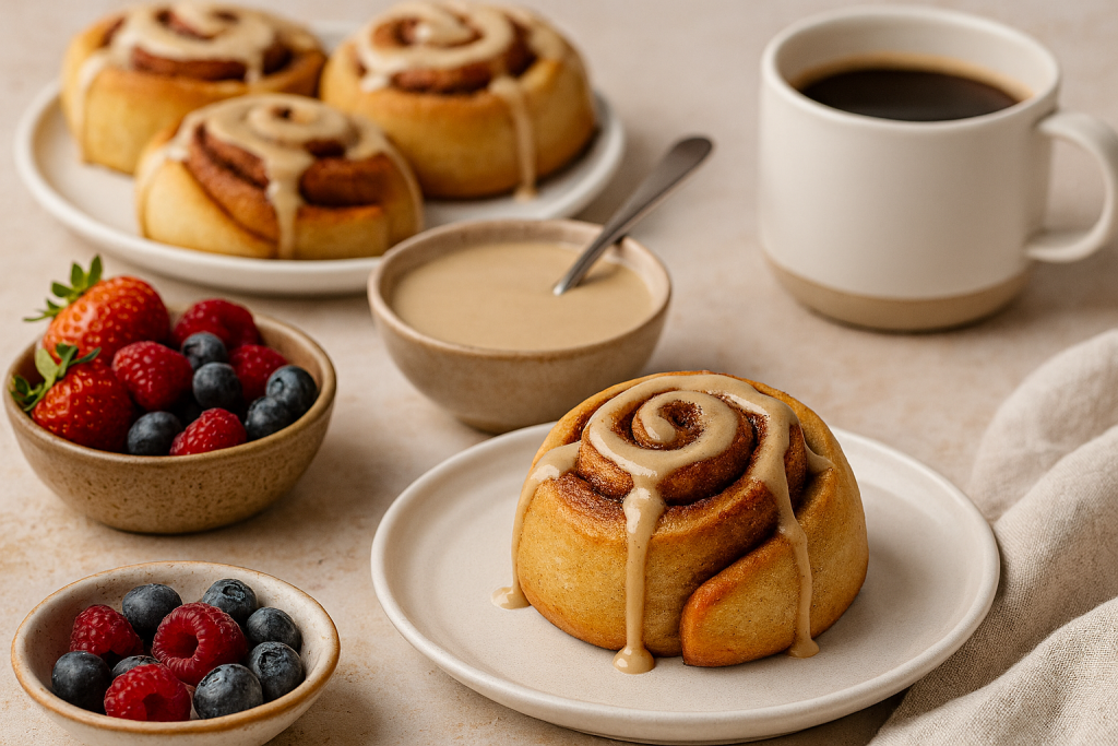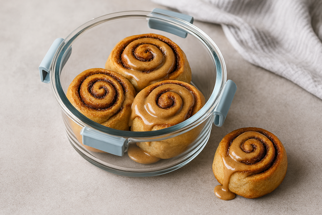 - Place cinnamon rolls evenly spaced in the baking dish and pour the tahini mixture evenly over them.